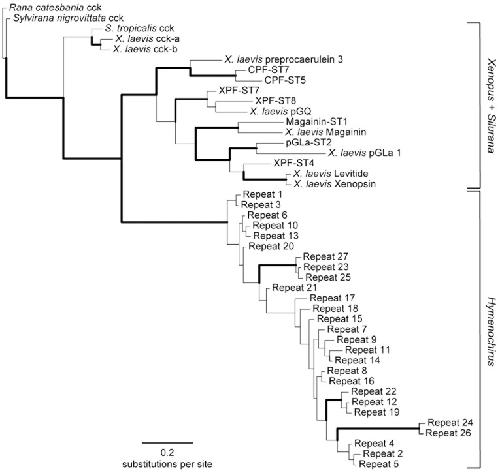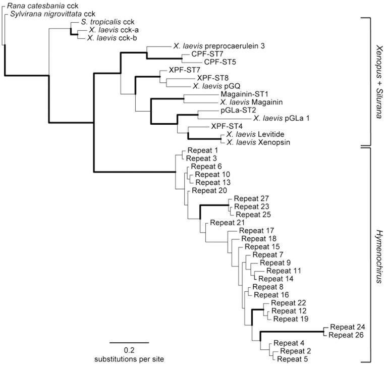 Figure 6. Figure 6. Phylogenetic relationships among pipid AMPs (exon 2).Phylogenetic relationships as inferred by Bayesian analysis of a data set consisting of exon 2 of amphibian cck genes and AMP genes in X. laevis and S. tropicalis, aligned with the corresponding repeat sections of the hymenochirin precursor proteins. Repeat numbers correspond to those in Figure 2. The depicted tree represents the Bayesian consensus phylogram rooted with cck genes. Branches are shown in bold if Bayesian posterior probability is above 0.95 and RAxML bootstrap is more than 75%.