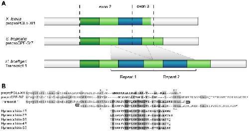 Figure 2. Overview of hymenochirin transcripts: amino acid sequences, structure and encoded peptides.A Deduced amino acid sequences of the hymenochirin transcripts. Previously published hymenochirins [27] are marked in grey; predicted novel encoded hymenochirins are marked in black. Small arrowheads indicate putative cleavage sites for the hymenochirins. Names of encoded hymenochirins are indicated on the right. B Comparative schematic representation of repeat sequences in the transcripts. The number of cDNA sequences represented by each transcript is indicated between brackets. Each repeat is represented by one larger and one smaller block (repeat sections), corresponding to exons 2 and 3 in S. tropicalis and X. laevis AMP genes. The numbers in the blocks correspond to unique repeat sections as used in the phylogenetic analyses. Hymenochirins encoded by the corresponding transcripts are indicated on the right; previously published hymenochirins [27] are labeled grey, the novel hymenochirins are labeled black.