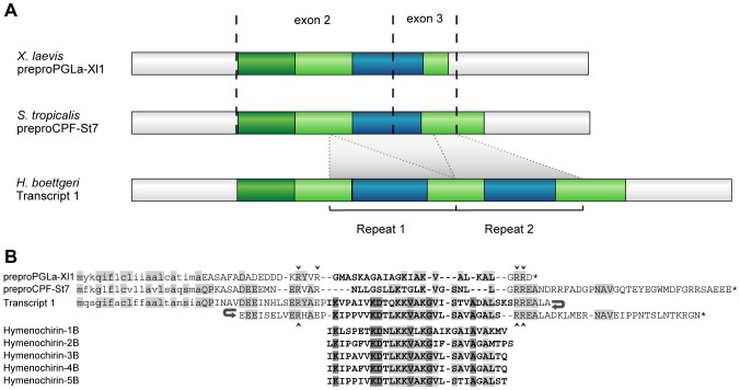 A Structure of hymenochirin transcript 1 (obtained from a breeding skin gland cDNA library of Hymenochrius boettgeri males) and of two AMP precursor proteins from Xenopus laevis and Silurana tropicalis. preproPGLa-Xl1: X. laevis PGLa precursor; preproCPF-St7: S. tropicalis CPF precursor. Region coloration distinguishes UTR (white), and sequences encoding signal peptide (dark green), spacer (light green) and antimicrobial peptides (blue). Dashed lines indicate known exon boundaries in Xenopus and Silurana AMP precursors. B Comparative alignment of the deduced amino acid sequence of the coding part of hymenochirin transcript 1 with two X. laevis and S. tropicalis AMP precursors and the previously published hymenochirins [27]. Predicted signal peptides are printed in lower case, antimicrobial peptides are printed in bold. Amino acids shared between the hymenochirin precursor and at least one of the other precursors are indicated in light grey. Residues identical between all hymenochirin peptides but not present in preproPGLa-Xl1 or preproCPF-St7 are labeled in dark grey. Small arrowheads indicate putative cleavage sites.