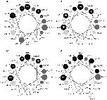 Figure 5. Helical wheel projections of the four peptides that were synthesized and tested for antimicrobial activity.A hymenochirin-6B; B hymenochirin-7B; C hymenochirin-10B; D hymenochirin-12B. Only the region of the peptide predicted to have an alpha-helical structure with a confidence level of 5 or more (PSIPRED v3.0 [30]) is shown in the projection. Amino acids are shaded according to the Combined Consensus Scale [31] with hydrophobic residues in white, nearly neutral residues in light grey, polar residues in dark grey, charged residues in black with+or - sign indicating charge. Helical wheels are adapted from http://cti.itc.virginia.edu/~cmg/Demo/wheel/wheelApp.html. Circle sizes indicate the relative distance from the N-terminal end of the peptide; smaller circles are further away.