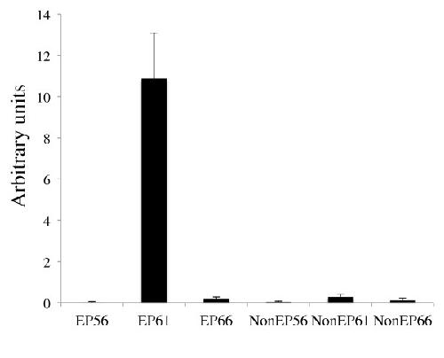 Figure 3. Upregulation of HAL2 gene only in the epithelium during Xenopus laevis intestinal metamorphosis. The epithelium (Ep) and the rest of the intestine (non-Ep), which is made of mainly the connective tissue, were isolated from tadpoles at stage 56 (the onset of metamorphosis, also referred to as a premetamorphic stage), stage 61 (the climax of metamorphosis), and stage 66 (the end of metamorphosis) [27]. The total RNA from the Ep and non-Ep was used for qRT-PCR analysis of HAL2 gene expression. Note that HAL2 was exclusively expressed in the Ep at the climax of metamorphosis.