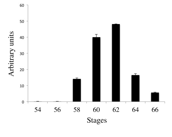 Figure 4. Upregulation of HAL2 during intestinal metamorphosis. Total RNA isolated from the intestine of animals from premetamorphic stage 54 to the end of metamorphosis (stage 66) was subjected to qRT-PCR analysis for HAL2 gene expression. Note that again HAL2 was found to have little or no expression before or after metamorphosis but was drastically upregulated during metamorphosis.