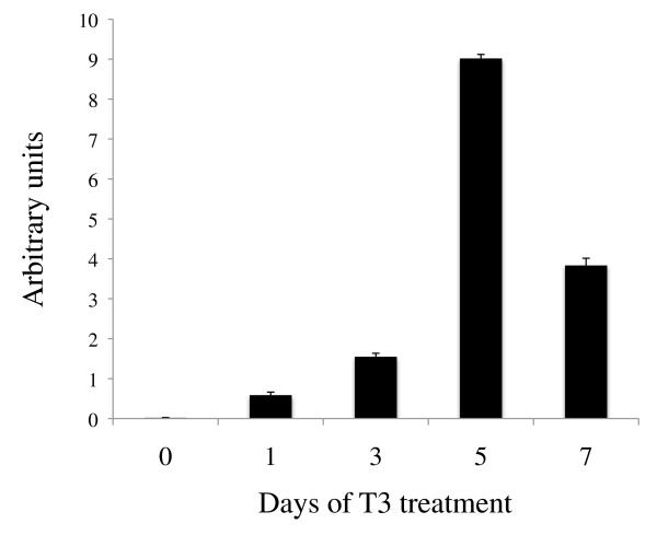 Figure 5. Dramatic upregulation of HAL2 by T3-treatment of premetamorphic tadpoles. Stage 54 premetamorphic tadpoles were treated with 10 nM T3 for 0-7 days and total intestinal RNA was isolated for expression analysis. Note that HAL2 expression was upregulated significantly after 1 day of treatment and the expression continued to increase dramatically during the treatment, peaking after 5 days.