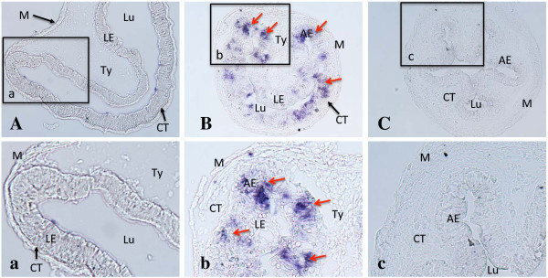 Figure 6. In situ hybridization analysis suggests specific expression of HAL2 in the proliferating adult intestinal progenitor/stem cells. ISH on intestinal cross-sections at stages 54 (A), 61 (B), and 66 (C) was carried out with anti-sense probe for HAL2. An enlarged photo of the boxed areas (a, b, c) in the top panels are shown in the lower panels. Note that HAL2 staining was found to be in clusters of cells located in between the dying larval epithelial cells and connective tissue at the climax of metamorphosis, where the proliferating adult epithelial cells are located [8,19,36,48], consistent with the expression data in Figures 3 and 4. AE, adult epithelium; CT, connective tissue; Lu, lumen; LE, larval epithelium; M, muscle; Ty, typhlosole.