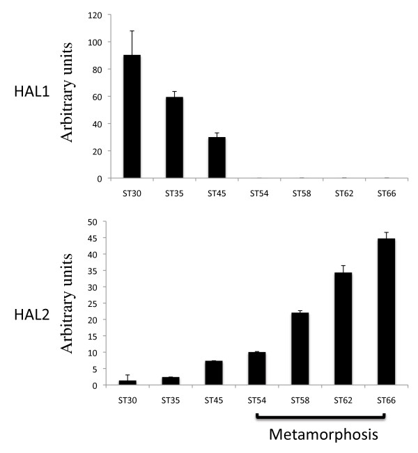 Figure 7. Distinct expression profiles of HAL1 and HAL2 during development. Total RNA isolated from whole animals from embryonic stage 30 to the end of metamorphosis (stage 66) was subjected to quantitative RT-PCR analysis for HAL1 and HAL2 gene expression. Note that HAL1 was expressed strongly in embryos and repressed after stage 45 when tadpole feeding begins while HAL2 was upregulated by stage 45 and its expression continued to rise till the end of metamorphosis.