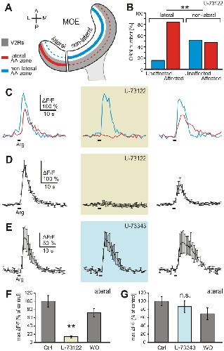 Figure 2. The PLC inhibitor U-73122 affects most of the L-arginine-induced Ca2+ responses in the lateral MOE.A, schematic representation indicating the approximate borders between the lateral and non-lateral part of the MOE of larval Xenopus laevis. Also given are the epithelial v2r-expression zone (grey band), and the location of the lateral (red line) and non-lateral (cyan line) amino acid-sensitive ORN subpopulations (see [7]). Note that the two subpopulations are not strictly confined to the lateral and non-lateral MOE, but rather gradually diminish from lateral to medial and medial to lateral epithelial positions (red and cyan dotted lines). B, relative number of ORNs unaffected and affected by U-73122 in the lateral (25 cells, 8 slices) and non-lateral (25 cells, 11 slices) part of the MOE, expressed as percentage of total ORNs tested. C, L-arginine-induced Ca2+ responses of two ORNs of an individual slice of the lateral MOE (cyan and red trace). Incubation with 10 µM U-73122 (application for 5 min; brown-shaded panel) led to a strong reduction of the Ca2+ transient in one of the ORNs (red trace), whereas the second ORN was not affected (cyan trace). The response of the affected ORN recovered after a washout time of 10 min (right-hand panel). D, mean Ca2+ transient (±SEM) of all five L-arginine-responsive ORNs of an acute slice preparation (lateral part of the MOE; all responsive ORNs of this slice were affected by U-73122). With 10 µM U-73122 in the bath solution (5 min; brown-shaded panel) the mean response is almost completely suppressed. After a washout time of 10 min the response recovered (right-hand panel). E, mean Ca2+ transient (±SEM) of all three L-arginine-responsive ORNs of another acute slice preparation (lateral part of the MOE) treated with U-73343 (10 µM; 5 min). The L-arginine response was not inhibited (light-blue-shaded panel). F, the average reduction of the Ca2+ transient of the ORN population affected by U-73122 was highly significant. G, the mean response amplitude (±SEM) of all ORNs tested (20 ORNs, 7 slices) was not significantly reduced by U-73343. Statistical analysis was performed using Chi-squared test (B, **p<0.01) and paired Student's t-test (F, **p<0.01; G, p>0.05). [AA-zone, amino acid-responsive zone; V2Rs, vomeronasal type 2 receptor expression zone; A, anterior; P, posterior; L, lateral; M, medial]. |