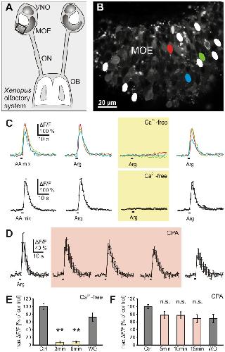 Figure 1. Amino acid-induced Ca2+ responses depend on extracellular Ca2+ and are independent of store depletion. A, schematic representation of the olfactory system of larval Xenopus laevis. The black rectangle indicates the approximate epithelial region of the slice shown in B. B, Fluo-4 stained acute slice of the MOE. The ovals represent all L-arginine-sensitive ORNs of this slice. C, time courses of intracellular Ca2+ transients of three amino acid-responsive ORNs (colored traces, see ovals in B) stimulated with a mixture of 19 amino acids (100 µM each) or L-arginine (100 µM) in standard and Ca2+-free bath solution. The L-arginine responses were abolished in Ca2+-free solution (yellow-shaded panel; application for 3 min) and recovered in standard bath solution. Mean Ca2+ transients ± SEM of all L-arginine-sensitive ORNs of the slice in B (11 ORNs) are shown in the lower part (black traces). D, depletion of intracellular Ca2+ stores via application of CPA (20 µM; light-red-shaded panel) did not affect L-arginine-evoked Ca2+ responses (shown as mean ± SEM of all three responsive ORNs of another acute MOE slice. E, mean responses (±SEM), expressed as percentage of control response to L-arginine, of 33 ORNs (11 slices) in standard (dark grey columns) and Ca2+-free bath solution (yellow columns; respectively 3 and 6 min after application of Ca2+-free bath solution). The responses were virtually abolished in Ca2+-free bath solution (**p<0.01; paired Student's t-test). F, mean responses (±SEM), expressed as percentage of control response to L-arginine, of 28 ORNs (6 slices) in standard (dark grey columns) and bath solution with 20 µM CPA (light-red columns; respectively 5, 10 and 15 min after application of CPA). Washout time was 5 min. No significant reduction of the Ca2+ responses was observed (p>0.05; paired Student's t-test). [AA mix, amino acid mixture; Arg, L-arginine; Ctrl, control; n.s., non significant; OB, olfactory bulb; ON, olfactory nerve; WO, washout]. |