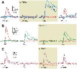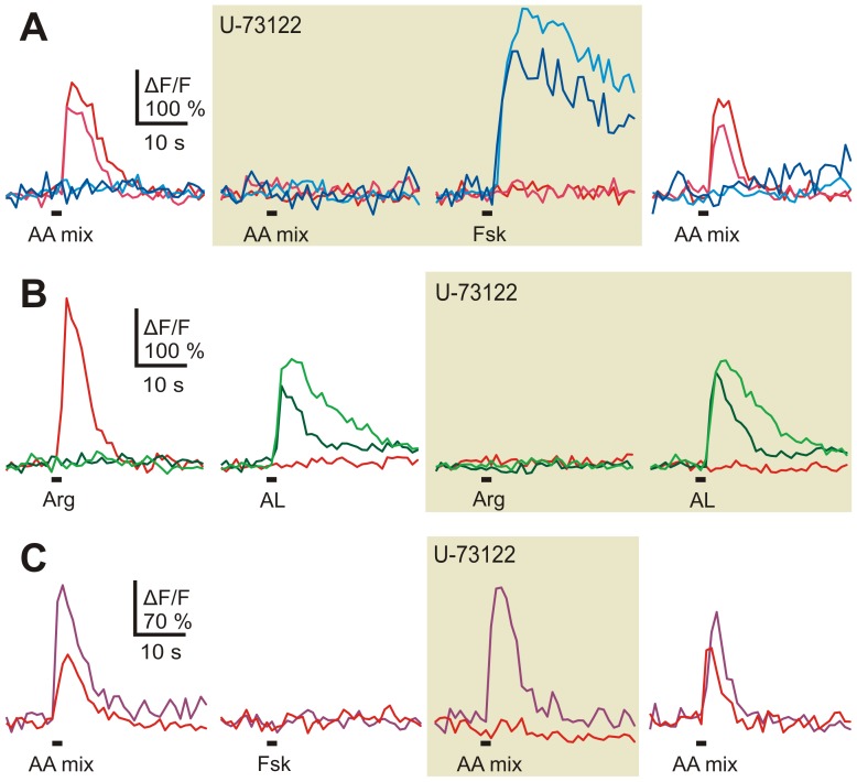 Figure 3. U-73122 specifically inhibits amino acid-sensitive ORNs.A, amino acid and forskolin-induced (50 µM) Ca2+ transients of four individual ORNs of an acute slice preparation of the lateral MOE (left-hand panel; red and magenta traces, amino acid sensitive ORNs; blue and cyan traces, forskolin-sensitive ORNs). U-73122 (10 µM; application for 5 min; brown-shaded panel) affected only the two amino acid-sensitive ORNs. After 10 min washout the response of the amino acid-sensitive ORNs recovered (right-hand traces). Similar results were obtained in all tested ORNs (42 cells, 3 slices). B, responses to L-arginine and alcohols, aldehydes and ketones of three individual ORNs of an acute slice preparation of the lateral MOE (left-hand panels; red trace, L-arginine-sensitive ORN; green traces, ORNs sensitive to alcohols, aldehydes and ketones). U-73122 (10 µM; 5 min; brown-shaded panel) did not affect Ca2+ transients induced by application of a mixture of alcohols, aldehydes and ketones. Note that the L-arginine-responsive ORN (red trace) was inhibited. Similar results were obtained in all tested ORNs (34 cells, 2 slices). C, two ORNs of an acute slice (lateral MOE) responded upon application of amino acids (red and purple traces). After application of U-73122 (10 µM; 5 min; brown-shaded panel) the response of one ORN (red trace) was suppressed, the response of the second ORN (purple trace) was unaffected. Both ORNs did not show sensitivity to forskolin (50 µM). After 10 min washout the response of the amino acid-sensitive ORN recovered almost completely (right-hand trace). Similar results were obtained in all four amino acid-sensitive ORNs that were unaffected by U-73122 (3 slices). [AL, mixture of alcohols, aldehydes and ketones; Fsk, forskolin]. |