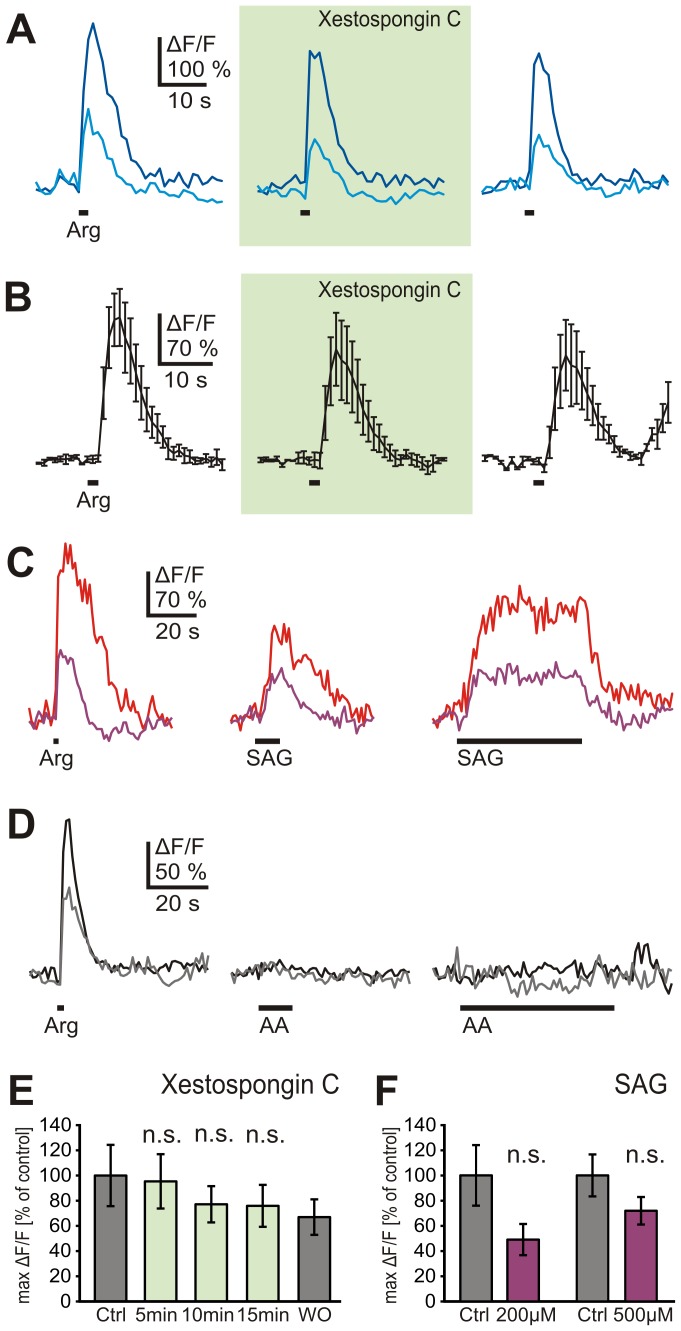 Figure 4. Diacylglycerol but not phosphatidylinositol-3-phosphate or arachidonic acid is involved in amino acid-signaling in the lateral MOE.A, L-arginine-induced Ca2+ responses of two ORNs of an individual slice of the lateral MOE (cyan and blue trace). Incubation with Xestospongin C (500 nM; application for 10 min; green-shaded panel) did not affect the responses. B, mean Ca2+ transients (±SEM) of all three L-arginine-responsive ORNs of an acute slice preparation (lateral MOE). The responses were not affected by Xestospongin C (500 nM; 10 min; green-shaded panel). C, L-arginine-induced Ca2+ responses of two ORNs of an individual slice of the lateral MOE (red and purple trace). Application of SAG (200 µM; 10 s, middle panel; 50 s, right-hand-panel) triggered Ca2+ increases in both ORNs. D, L-arginine-induced Ca2+ responses of two ORNs of an individual slice of the lateral MOE (black and grey trace). Both ORNs did not respond upon application of AA (50 µM; 10 s, middle panel; 60 s, right-hand-panel) E, mean responses (±SEM), expressed as percentage of control response to L-arginine, of 14 ORNs (4 slices) in standard (dark grey columns) and bath solution with Xestospongin C 500 nM (green columns; respectively 5, 10 and 15 min after application of Xestospongin C; washout time was 5 min). No significant reduction of the Ca2+ responses was observed (p>0.05; paired Student's t-test). F, mean response amplitudes (±SEM) upon application of L-arginine (dark grey columns) and SAG (purple columns; 200 and 500 µM; 7 ORNs, 2 slices and 9 ORNs, 2 slices, respectively). The response amplitudes to SAG were lower but not significanty different from the L-arginine responses (p>0.05; paired Student's t-test). [AA, arachidonic acid]. |