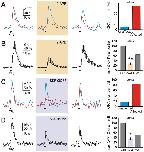 Figure 5. TRP channel blockers affect most of the L-arginine-induced responses.A, L-arginine-induced Ca2+ responses of two ORNs of an individual slice of the lateral MOE (cyan and red trace). Incubation with 2-APB (100 µM; application for 5 min; orange-shaded panel) led to a strong reduction of the Ca2+ transient in one of the ORNs (red trace), whereas the second ORN was not affected (cyan trace). The response of the affected ORN recovered after 10 min of washout (right-hand traces). The bar diagram shows ORNs unaffected and affected by 2-APB (100 µM; 5 min), expressed as percentage of total ORNs tested (27 cells, 6 slices). B, mean Ca2+ transient (±SEM) of seven L-arginine-responsive ORNs of an acute slice preparation (lateral MOE; only blocker-affected ORNs included). With 2-APB in the bath solution (100 µM; 5 min; orange-shaded panel) the mean response is partially suppressed. After 10 min washout the response recovered almost completely (right-hand trace). The bar diagram shows that application of 2-APB (100 µM; 5 min) reduced the amplitude of the Ca2+ transients to 27% of the control application (24 ORNs, 6 slices). C, L-arginine-induced Ca2+ responses of two ORNs of another individual slice of the lateral MOE (cyan and red trace). Incubation with SKF-96365 (80 µM; 10 min; lilac-shaded panel) led to a strong reduction of the Ca2+ transient in only one of the two ORNs (red trace). The response of the affected ORN recovered after 10 min of washout (right-hand traces). ORNs unaffected and affected by SKF-96365, expressed as percentage of total ORNs tested (histogram; 25 cells, 4 slices). D, mean Ca2+ transient (±SEM) of four L-arginine-responsive ORNs of an acute slice preparation (lateral MOE; only blocker-affected ORNs included). With SKF-96365 in the bath solution (80 µM; 10 min; lilac-shaded panel) the mean response is partially suppressed. After 10 min washout the response slightly recovered (right-hand trace). Application of SKF-96365 (80 µM; 10 min) reduced the amplitude of the Ca2+ transients to 35% of the control application (bar diagram; 21 ORNs, 4 slices). Statistical analysis was performed using paired Student's t-test; *p<0.05, **p<0.01. [SKF, SKF-96365]. |