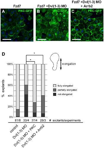 Figure 3. Arrb2 functionally interacts with Dvl in Wnt/Ca2+ signaling.Xenopus embryos were injected with 500 pg pkcα-gfp RNA and co-injected as indicated above the images. Animal Caps were prepared at stage 10 and immunostained as indicated. Nuclei were stained with Hoechst 33258 (blue). Images show representative results from at least two independent experiments with a minimum of six Animal Caps per experiment. Scale bars: 50 µm. Fzd7 induced PKCα-GFP translocation (A) was impaired by a triple knock-down of Dvl1, Dvl2 and Dvl3 (B). (C) Co-expression of Arrb2 partially rescued PKCα-GFP translocation in the triple Dvl knock-down. (D) Triple Dvl knock-down inhibited elongation of Keller open face explants. Co-injection of PCKα or Arrb2 mRNA rescued the CE phenotype of triple Dvl morphant explants. The average percentage of explants showing full (75-100%, light grey), partial (25-50%, medium grey) or no elongation (<25%, dark grey) from at least three independent experiments are shown. Asterisks indicate statistically significant deviations in the percentage of fully elongated explants (* p>0.95, t-test).