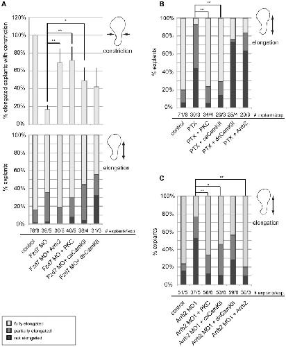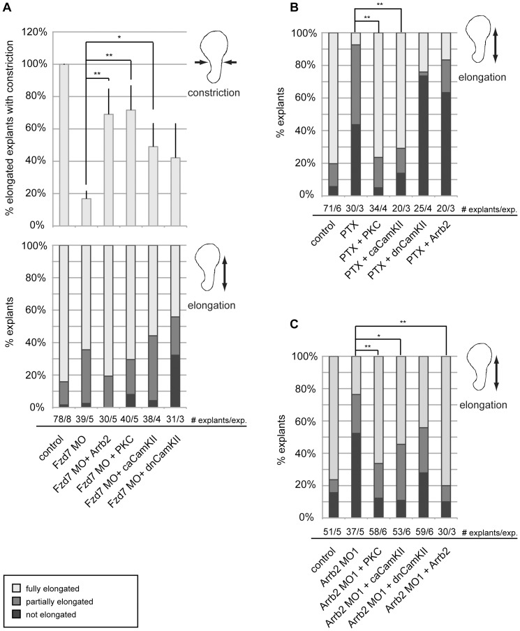 Figure 4. Arrb2 is required for CE movements downstream of Frizzled 7 and upstream of PKCα.Xenopus embryos were injected at 4-cell stage in the marginal zone of both dorsal blastomeres as indicated. CE movements in the dorsal mesoderm were monitored by elongation of Keller open face explants. The average percentage of explants showing full (75-100%, light grey), partial (25-50%, medium grey) or no elongation (<25%, dark grey) from at least three independent experiments (exp.) are shown. Asterisks indicate statistically significant deviations in the percentage of fully elongated explants (** p>0.99,* p>0.95, t-test). (A) Frizzled 7 knock-down had little effect on elongation (bottom graph) but impaired constriction. Only fully elongated explants (represented by light grey columns in bottom graph) were additionally scored for constriction. The percentage of elongated explants that showed normal constriction are shown in the upper graph as average values plus SEM. Co-injection of arrb2 or pkcα mRNA fully rescued constriction and ca camkII mRNA partially rescued constriction. (B) PTX treatment impaired elongation of Keller open face explants. Co-injection of pkcα or ca camkII mRNA fully rescued explant elongation, while dn camkII or arrb2 mRNA did not. (C) Knock-down of Arrb2 interfered with explant elongation and was rescued by co-injection of pkcα, ca camkII or a MO-insensitive arrb2 RNA.