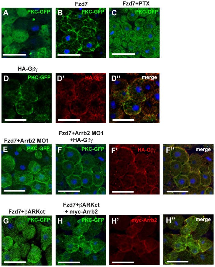 Figure 2. Arrb2 depends on Gβγ to induce membrane translocation of PKCα.Xenopus embryos were injected with 500 pg pkcα-gfp RNA and co-injected as indicated above the images. Animal Caps were prepared at stage 10 and immunostained as indicated. Nuclei were stained with Hoechst 33258 (blue). Images show representative results from at least two independent experiments with a minimum of six Animal Caps per experiment. Scale bars: 50 µm. (A) PKCα-GFP control, PKCα-GFP localized predominantly to the cytoplasm. (B) Co-injection of 1ng fzd7 RNA induced PKCα-GFP translocation to the plasma membrane. (C) Treatment with PTX for 1 hour blocked Fzd7-induced PKCα-GFP translocation. (D) Overexpression of HA-Gβ and HA-Gγ subunits (indicated as HA-Gβγ) induced PKCα-GFP translocation (HA-Gβγ stained with anti-HA (red): D′, merge: D). The inhibitory effect of Arrb2 MO1 (E) on PKCα-GFP membrane translocation was rescued by (F) co-injection of HA-Gβ and HA-Gγ mRNA (anti-HA (red): F′, merge: F). (G) Overexpression of the Gβ-sequestering β-ARKct also blocked Fzd7 induced PKCα-GFP translocation. (H) Co-expression of myc-Arrb2 in Fzd7 and β-ARKct injected Animal Caps was not sufficient to rescue PKCα-GFP membrane translocation (anti-myc (red): H′, merge: H).