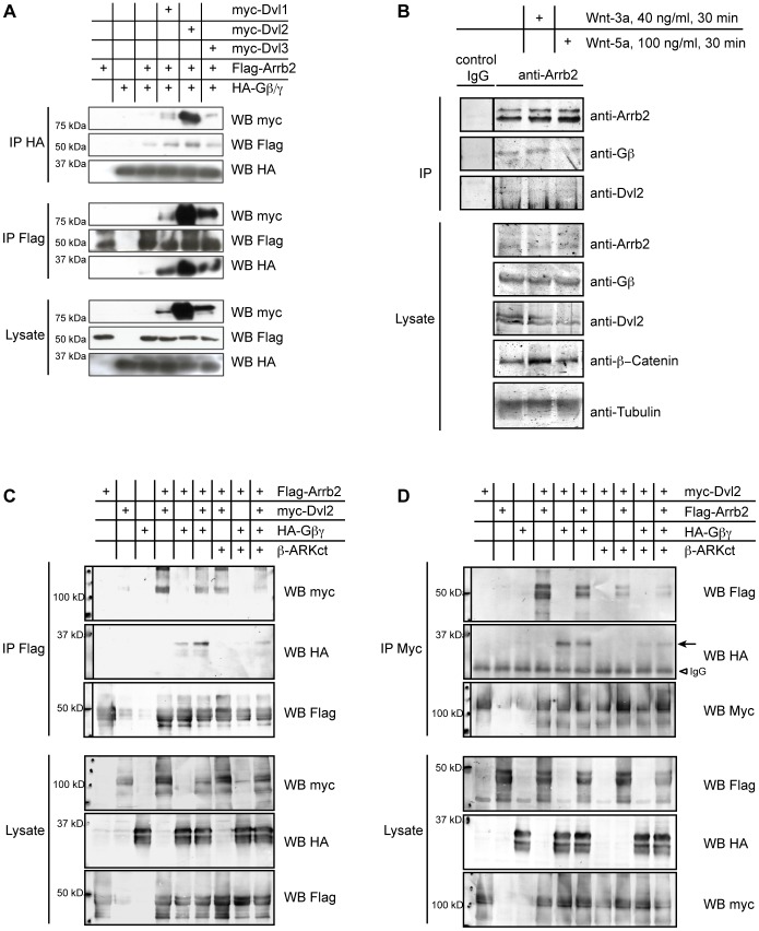 Figure 5. Arrb2 physically interacts with Gβ and Dvl.Epitope-tagged proteins were overexpressed, immunoprecipitated and detected by Western Blotting as indicated. (A) Flag-Arrb2 was co-expressed with a combination of HA-Gβ1 and HA-Gγ2 to allow the formation of Gβγ heterodimers (Gβγ). Co-expression of Dvl1, Dvl2 or Dvl3 enhanced the interaction between Arrb2 and Gβ1 in co-immunoprecipitation experiments from HEK 293T cells. (B) Endogenous Gβ and Dvl2 were detected in immunoprecipitates of endogenous Arrb2 from unstimulated and Wnt-stimulated HEK 293T cells. (C) Binding of Dvl2 to Arrb2 was also observed in the absence of exogenous Gβ. Myc-Dvl2 co-precipitated equally well with Flag-Arrb2 when Gβ1 and Gγ2 were overexpressed (Gβγ) as in the presence of the Gβ-sequestering β-ARKct in HEK 293T cells. By contrast, binding of Gβ1 to Arrb2 was impaired by β-ARKct and partially restored by co-expression of Dvl2. (D) When myc-Dvl2 was precipitated, the amount of Flag-Arrb2 and that of Gβ1 that co-precipitated with Dvl2 was significantly reduced by the co-expression of β-ARKct.