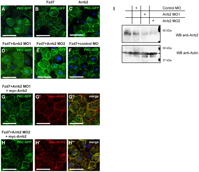 Figure 1. Arrb2 is required for membrane translocation of PKCα.Xenopus embryos were injected with 500 pg pkcα-gfp RNA and co-injected as indicated above the images. Animal Caps were prepared at stage 10 and immunostained as indicated. Nuclei were stained with Hoechst 33258 (blue). Images show representative results of at least three independent experiments with a minimum of six Animal Caps per experiment. Scale bars: 50 µm. (A) PKCα-GFP localized predominantly to the cytoplasm. (B) Co-injection of 1ng fzd7 RNA induced PKCα-GFP translocation to the plasma membrane. (C) Overexpression of Arrb2 partially induced PKCα-GFP membrane translocation. Co-injection of fzd7 mRNA with 0.8 pmol Arrb2 MO1 (D) or 0.8 pmol Arrb2 MO2 (E) blocked PKCα-GFP localization to the plasma membrane, while a Control MO had no effect (F). (G) The inhibitory effect of Arrb2 MO1 on PKCα-GFP membrane translocation was rescued by co-expression of myc-Arrb2 (anti-myc (red): Gâ², merge: G"). (H) Comparably, inhibition of PKCα-GFP membrane translocation by Arrb2 MO2 was restored by co-expression of myc-Arrb2 (anti-myc (red): Hâ², merge: H"). (I) Western Blot of Animal Cap lysates prepared from stage 10 embryos, which were either uninjected or injected with Control MO, Arrb2 MO1 or Arrb2 MO2 as indicated. Both Morpholinos efficiently downregulated proteins levels of endogenous Arrb2; an immunoblot for β-Actin is shown as loading control.