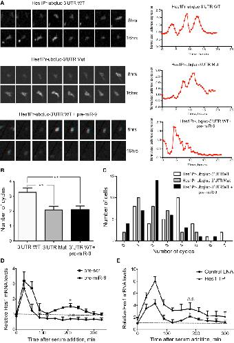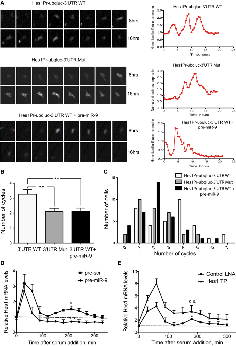 Figure 2. miR-9 Modulates Hes1 Oscillations(A) Representative examples of live imaging and luminescence quantification of single neural progenitor c17.2 cells expressing a ubiquitinated luciferase under the control of Hes1 promoter and fused to either the wild-type (Hes1Pr-ubqluc-3′UTR WT) with or without miR-9; or the mutant Hes1 3′ UTR (Hes1Pr-ubqluc-3′UTR Mut), which cannot bind miR-9.(B) Average number of Hes1 oscillation cycles over an average of 20 hr imaging period. Error bars represent SEM. ∗∗p < 0.01 analyzed by two-tailed Mann-Whitney U test.(C) Frequency distribution of cells displaying different number of Hes1 cycles over 20 hr imaging period.(D and E) Relative expression of Hes1 mRNA upon serum stimulation in synchronized c17.2 cells transfected with either scrambled/miR-9 precursors (D) or Control LNA/Hes1 target protector (E).Data are presented as mean ± SEM from three independent experiments. The statistical significance of the Hes1 mRNA levels in the second peak (t = 180-210) over basal levels (indicated with a dashed line in the control) was examined using Student's t test ∗p < 0.05, ∗∗p < 0.01. See Figure S2.