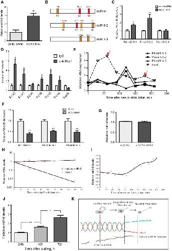 Figure 4. Hes1 Negatively Regulates miR-9 Transcription(A) The expression levels of mature miR-9 in c17.2 cells transfected with either control or Hes1 siRNA as examined by qRT-PCR.(B) Bioinformatic prediction for the presence of Hes1 binding elements (N-boxes) in the 2 kB regions upstream of the miR-9 precursors. N-boxes in the (+) strand are depicted in red, while N-boxes in the (–) strand are in orange.(C) qRT-PCR for relative levels of the primary miR-9 transcripts in c17.2 cells transfected with control siRNA or Hes1 siRNA.(D) Recruitment of endogenous Hes1 to miR-9-1 and miR-9-2 promoters as revealed by ChIP-qPCR. IgG, negative control; Gapdh, Gapdh promoter sequence.(E) Dynamic expression of Hes1 mRNA and the three primary miR-9 transcripts analyzed by qRT-PCR in synchronized c17.2 cells upon serum stimulation at t = 0 (Hes1 peaks are indicated with arrows).(F) qRT-PCR for relative levels of the primary miR-9 transcripts in c17.2 cells transfected with either control (pCS2) vector or Hes1 (pCS2-Hes1).(G) The expression levels of mature miR-9 in c17.2 cells transfected with either control or Hes1 vector as examined by qRT-PCR.(H) qRT-PCR for expression levels of mature miR-9 compared to Hes1 mRNA after blocking transcription with Actinomycin D.(I) Relative expression of mature miR-9 analyzed by qRT-PCR in synchronized c17.2 cells upon serum stimulation at t = 0.(J) qRT-PCR for mature miR-9 levels in c17.2 cells grown in proliferating conditions (10% serum) 24, 48, and 72 hr after plating.(K) Model depicting the oscillations of pri-miR-9 s driven by Hes1, which leads to the gradual accumulation of mature miR-9 and eventual dampening of the oscillations, followed by neural differentiation On all panels values are represented as mean ± SEM. ∗p < 0.05; ∗∗p < 0.01; ∗∗∗p < 0.001 analyzed by Student's t test.See Figure S4.