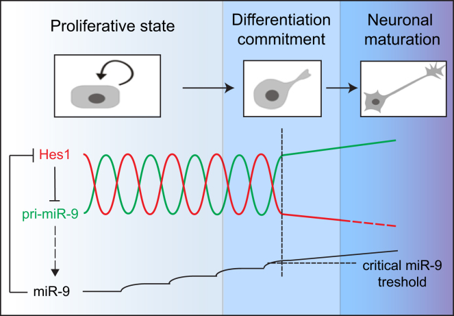 Short-period (ultradian) oscillations of Hes1, a Notch signaling effector, are essential for maintaining neural progenitors in a proliferative state, while constitutive downregulation of Hes1 leads to neuronal differentiation. Hes1 oscillations are driven by autorepression, coupled with high instability of the protein and mRNA. It is unknown how Hes1 mRNA stability is controlled and furthermore, how cells exit oscillations in order to differentiate. Here, we identify a microRNA, miR-9, as a component of ultradian oscillations. We show that miR-9 controls the stability of Hes1 mRNA and that both miR-9 overexpression and lack of miR-9 dampens Hes1 oscillations. Reciprocally, Hes1 represses the transcription of miR-9, resulting in out-of-phase oscillations. However, unlike the primary transcript, mature miR-9 is very stable and thus accumulates over time. Given that raising miR-9 levels leads to dampening of oscillations, these findings provide support for a self-limiting mechanism whereby cells might terminate Hes1 oscillations and differentiate.