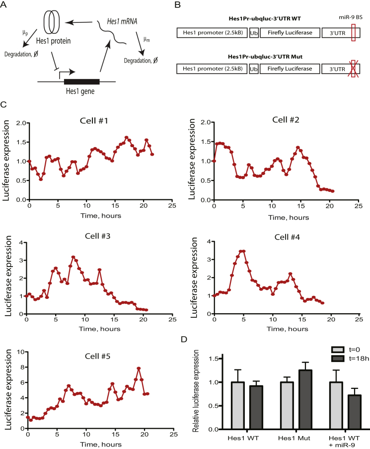 Figure S2. Real-Time Imaging of Hes1 Expression in c17.2 cells, Related to Figure 2(A) Schematic simplified model of Hes1 oscillator, driven by negative feedback loop, delay (not shown) and high degradation rate of both the protein (mp) and the mRNA (mm). For a detailed model see Momiji et. al., 2008.(B) miR-9 binding site (BS) in the 3′ UTR of the Hes1 ubiquitinated luciferase reporter (Shimojo et.al., 2008) was mutated to generate Hes1Pr-ubqluc-3′UTR Mut construct.(C) Quantification of the bioluminescence of Hes1 reporter expression in individual transfected c17.2 cells over ∼20 hr imaging period. Luciferase expression was normalized to 1 at t = 0 for all cells.(D) Quantification of the average bioluminescence of the Hes1 reporter at the beginning (t = 0) and toward the end of the single cell imaging experiment (t = 18h) (n = 34 cells in each condition).