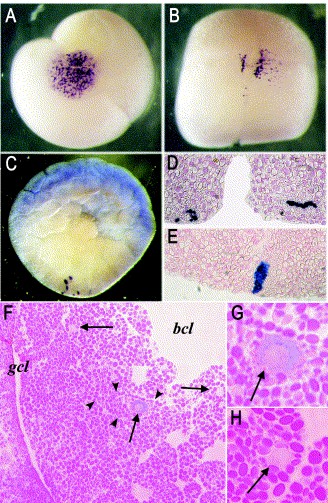 Fig. 4. Analysis of localization of Germes mRNA during early Xenopus development by in situ hybridization. (A,B) Whole-mount hybridization of two- (A) and eight-cell (B) stage embryo, vegetal view. Germes RNA localizes within small individual granules at the vegetal pole of two-cell stage embryo (A). These granules appear to aggregate into lager complexes in the vegetal cortex of eight-cell embryo (B). (C) Transparent Epon block of early blastula, containing half of the embryo and viewed from above. Small Germes RNA-staining islands have coalesced into a few aggregates, settling inside the vegetal cells. (D,E) Epon sections of eight-cell (D) and early blastula (E) (same embryo as in (C)) stages. Aggregating granules have lost their connection with the vegetal cortex and change their position inside the cells. (F) Epon section of mid-gastrula stage. There is a Germes RNA-positive PGC in endoderm mass. Higher magnification of the same slide (G) shows perinuclear localization of the transcript. Compare yolk-free stained perinuclear region of PGC (G) with yolk-reach cytoplasm of endodermal cells (H). bcl, blastocoel; gcl, gastrocoel; nuclei are marked by arrows. The border of PGC, discernible at higher resolution, is marked by arrowheads.