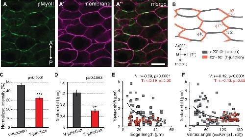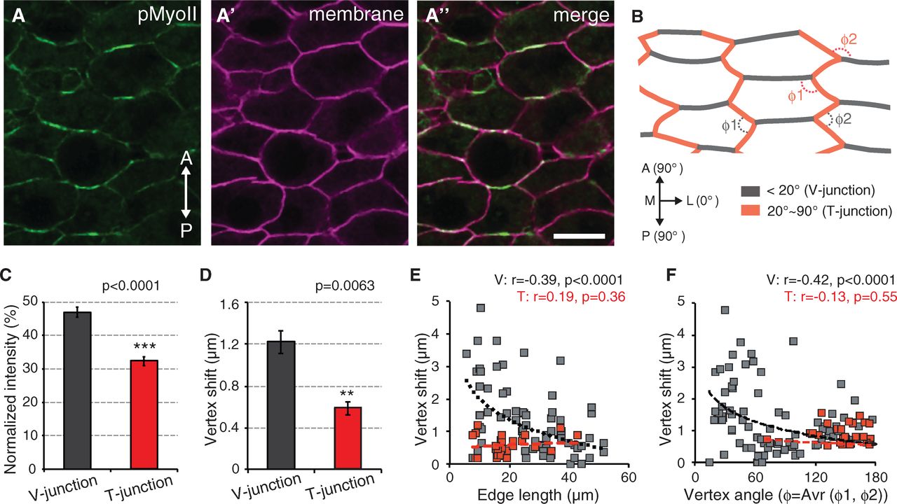 (A to A″) pMyoII immunostaining of notochord in vivo (scale bar indicates 20 μm). (B) Illustration defining t- and v-type junctions and vertex angle ϕ (gray, ϕ for v-junction; red, ϕ of t-junction). A, anterior; P, posterior; M; medial; L, lateral. (C) Normalized intensity of pMyoII, defined as intensity relative to the maximum (=100%) and minimum (=0%) raw intensity for each image (n = 177 for v and 221 for t; three embryos). (D) Average vertex position change after ablation. Error bars indicate SE. (E and F) Scatter plots showing correlation between tension and edge length (E) or vertex angle (F) (n = 84 for v and 24 for t; 54 embryos).