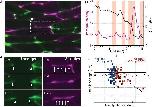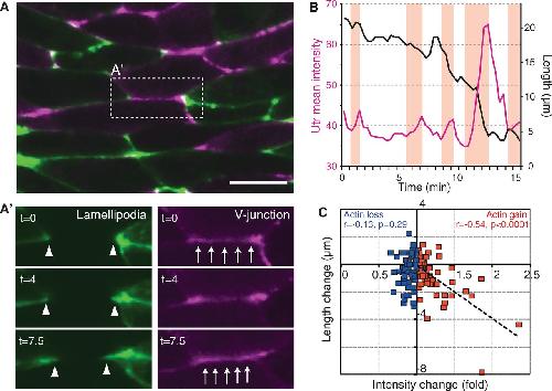 (A) Mosaic expression of two colors of the actin biosensors utrophin-FP. (A′) Time-lapse after the junction in box A′. Two populations of actin are visible: bipolar lamellipodia (green, arrowheads) and actin at the v-junction (magenta, arrows). (B) Mean intensity of utrophin (Utr, pink line) at v-junctions during edge length shortening (black line). (C) Edge length change is correlated with increase of utrophin intensity (red) but not with reduction in utrophin intensity (blue) (n = 133 cycles; six explants).