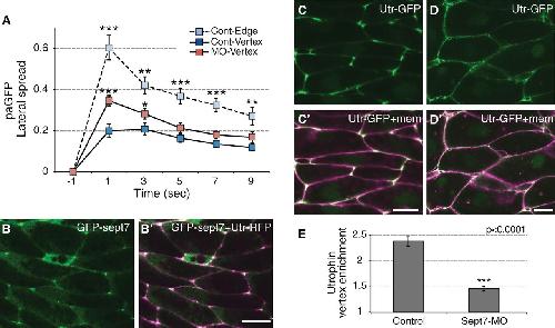 (A) Quantification of the lateral spread of paGFP-Utr at a cell vertex or edge (fig. S10A) (*P < 0.05, **P < 0.001, ***P < 0.0001, n = 7 to 11 explants). (B) GFP-sept7 localization in explant. (B′) GFP-sept7 colocalizes with Utr–red fluorescent protein (RFP) at vertices. (C and C′) Utr-GFP normally localizes at vertices. (D and D′) Sept7 knockdown disrupts utrophin accumulation at the vertices. (E) Quantification of (C) and (D) (see also fig. S7B). Scale bar, 20 μm; error bars, SE.