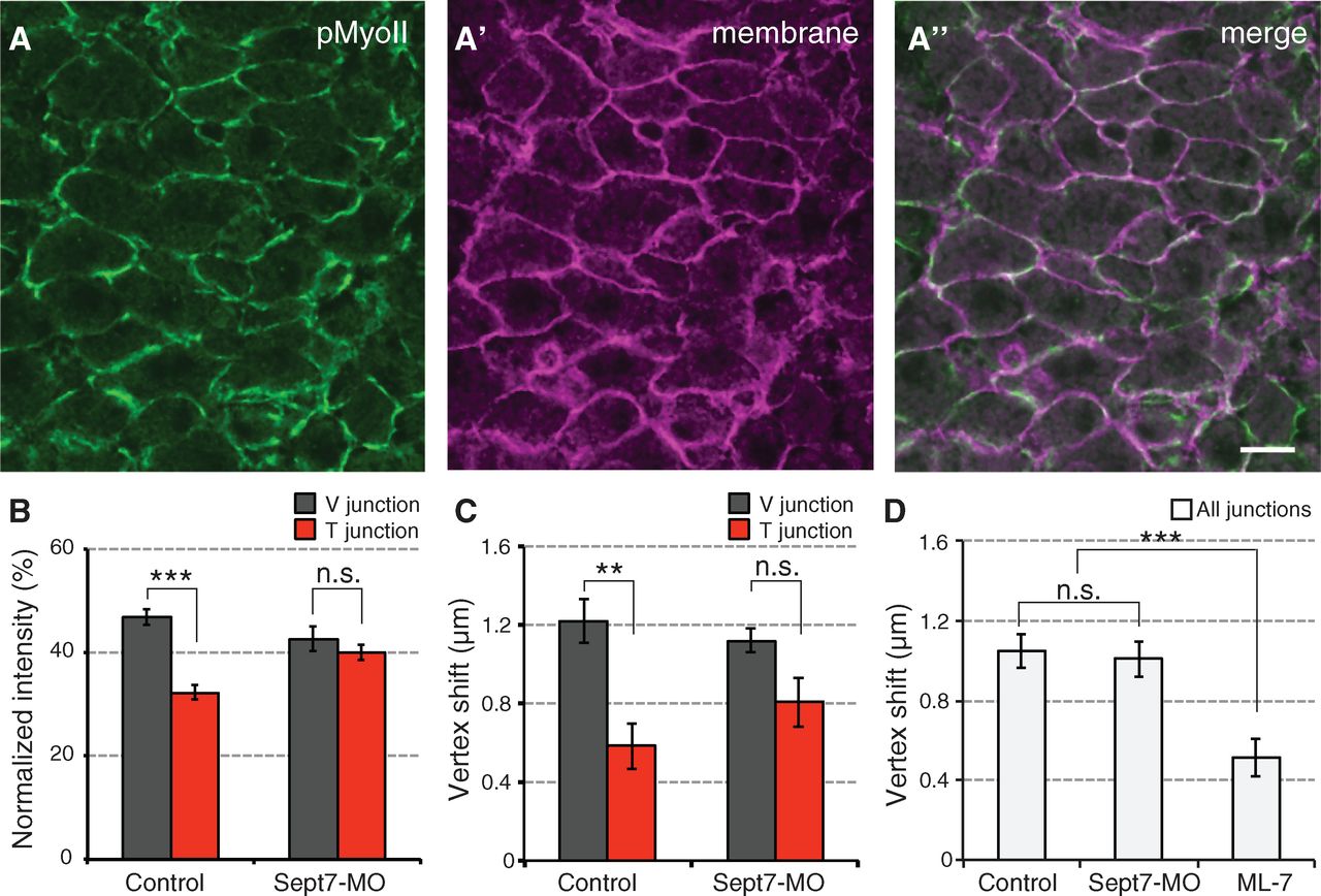 (A to A″) pMyoII immunostaining of notochord in Sept7 knockdown embryos (compare with Fig. 1A) (scale bar, 20 μm). (B and C) The normal differences in pMyoII or vertex shift after laser ablation between v- and t-junctions are lost in Sept7 morphants (Sept7-MO). For (B), n = 74 for v and 188 for t; three embryos. For (C), n = 50 for v and 28 for t; 39 explants. (D) Average vertex shift for all junctions is not changed after Sept7 knockdown but is significantly reduced by treatment with a myosin kinase inhibitor (for control, n = 108; for sept7-MO, n = 78; for ML-7, n = 36, 111 explants). n.s., not significant; error bars, SE.