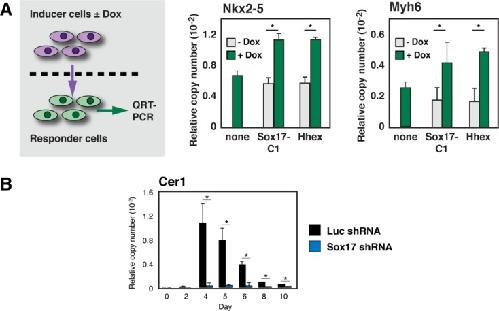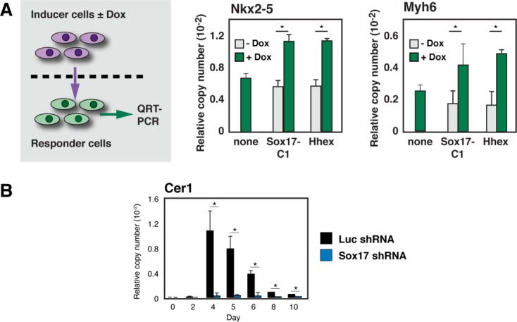 Figure 2. Sox17 regulates secreted signals for cardiac differentiation. (A): (Left) Schematic cartoon of the experimental design. For details of the Sox17 gain-of-function mutation refer Figure 4D and Supporting Information Figure S5B–S5D. (Right) QRT-PCR results for Nkx2–5 and Myh6. (B): Corroboration by QRT-PCR of Cer1 induction as contingent on Sox17. *, p < .05 versus control cells; n ≥ 3. Abbreviation: QRT-PCR, quantitative real-time RT-PCR.
