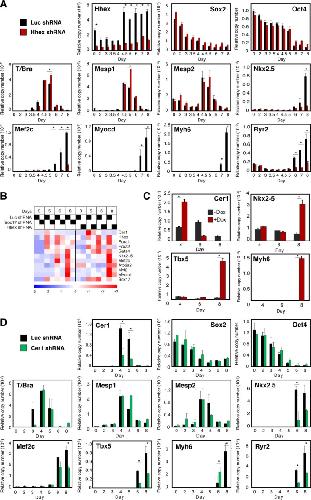 Figure 3. The Sox17-dependent genes Hhex and Cer1 are important for cardiac myogenesis in differentiating ESCs. (A–C): Hhex and (D) Cer1 shRNA suppressed the respective cognate genes in differentiating ESCs and inhibited the induction of cardiac transcription factors and structural genes, acting at a stage subsequent to induction of Mesp1/2. *, p < .05 versus control cells; n ≥ 3. (A, D): Results are shown for the most potent of the shRNAs tested, measured by effectiveness against the endogenous transcripts. For each gene, qualitatively similar results were obtained using at least two independent shRNAs. (B): Partial comparison of the microarray findings with Hhex and Sox17 shRNAs, illustrating the shared impairment of Cer1, cardiac transcription factors, and cardiac structural genes. In addition, a potential positive feedback loop between Hhex and Sox17 is noted. n = 2 for Hhex shRNA; n = 1 for the Luc shRNA controls. (C): Ectopic Cer1 expression rescues cardiac differentiation in Hhex-knock down ESCs. Cer1 was encoded by a tetO-regulated lentiviral vector, and was induced on day 3 by doxycycline. Gene expression was assayed by QRT-PCR. *, p < .05 versus control cells; n ≥ 3.