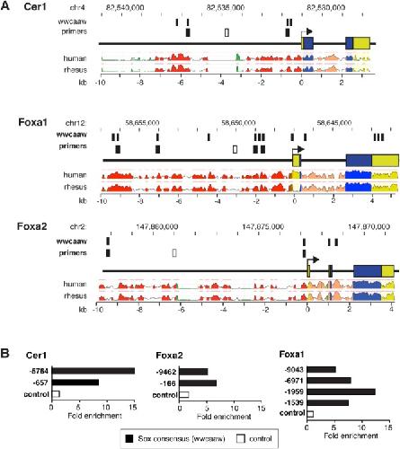 Figure 5. Sox17 binds to evolutionarily conserved Sox sites in the Cer1 upstream region. (A): Predicted Sox17 binding sites in the Cer1, Foxa1, and Foxa2 loci. Primers corresponding to predicted binding sites versus irrelevant control regions are indicated in black and white, respectively. Conservation profiles are shown for the human and rhesus orthologs (range, 50%–100%). Pink bars above the profiles denote regions of conservation with the mouse genome; blue, coding exons; yellow, untranslated regions; salmon, introns; red, intergenic regions; green, transposons and simple repeats. (B): Chromatin immunoprecipitation, assayed by quantitative PCR, shown as the fold enrichment for the indicated regions (V5 antibody, normalized for nonspecific precipitation by nonimmune IgG). Black, predicted Sox binding sites; white, irrelevant regions. For Foxa1 and Foxa2 refer Figure 6A.
