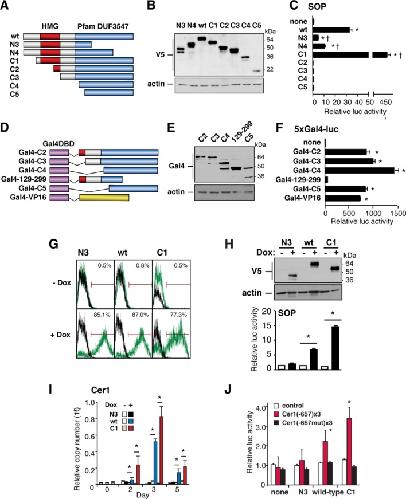 Figure 6. Sox17 activates Cer1. (A–F): Mapping the Sox17 transactivation domain. (A) Schematic representation of the Sox17 deletion mutants. Domain of unknown function 3547 (Pfam 24.0) designates the conserved C-terminal region of F group Sox proteins. (B): Western blot analysis of the constructs in 293T cells. (C): Sox-dependent reporter gene activity (SOP-FLASH) in 293T cells, in the presence of cotransfected Sox17 expression vectors. Deletion of the N terminus (C1) increases the transcriptional activity. Deletions of the conserved C-terminal domain (N3, N4) attenuate transactivation. (D): Schematic representation of the GAL4DBD-Sox17 fusion proteins. (E): Western blot analysis of the constructs in 293T cells, using antibody to Gal4. (F): Reporter gene activity (5xGal4-luc) in 293T cells, induced by GAL4-Sox17 vectors. Deletion of the Sox17 C-terminal domain (GAL4 129–299) cripples transactivation. Other constructs showed activity equal to or greater than that of GAL4-VP16. (G, H): Doxycycline-dependence of the Sox17 vectors, measured in AB2.2 cells by flow cytometry (G), Western blotting (H, above), and transactivation of SOP (H, below). (I): Wild-type Sox17 and the C1 truncation both induce endogenous Cer1. n ≥ 3; *, p < .05 versus control embryonic stem cells. (J): The multimerized Sox17 site at −657 of the Cer1 locus mediates Dox-dependent, sequence-specific trans-activation. n = 6; *, p < .01 versus the absence of Dox.