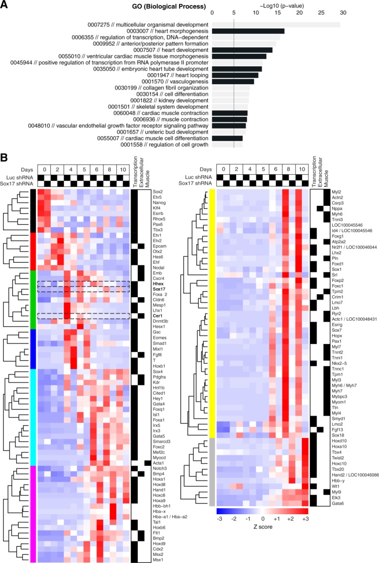 Figure 1. Sox17-dependent genes in differentiating ESCs.(A): The top 20 GO biological process terms that were dysregulated in Sox17-deficient mouse ESCs. Those specific for cardiovascular development and function are highlighted (black), and a p-value of 1E-5 is noted for reference (Supporting Information Figs. S1, S2). (B): Heat map of gene expression levels for 126 Sox17-regulated genes from a curated gene set related to cardiac myogenesis (Supporting Information Table S2). Genes that fulfill the filtering criteria in Supporting Information Figure S1A are presented, grouped according to the temporal clusters obtained from the whole-transcriptome analysis (Supporting Information Fig. S1D). Functional annotations are shown at the right for transcription factors, extracellular/membrane proteins, and muscle-specific genes for cardiac contractility. For the complete set of affected genes refer Supporting Information Figure S3. Sox17, Hhex, and Cer1 are highlighted. Abbreviation: GO, gene ontology.