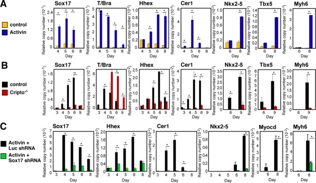 Figure 4. Sox17 mediates the Activin/Nodal pathway for cardiac myogenesis. (A): Induction of Sox17, Hhex, Cer1, and cardiac genes in Activin-treated embryonic stem cells (ESCs). (B): The Nodal receptor Cripto is essential for induction of the endoderm-associated Sox17-Hhex-Cer1 pathway. (C): Sox17 shRNA recapitulates the Cripto-deficient phenotype in Activin-treated ESCs. Cells were grown in monolayer culture for panels (A) and (C), and as embryoid bodies for panel (B). *, p < .05 versus control cells; n ≥ 3.