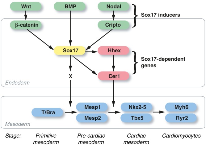 Figure 7. The Sox17-Hhex-Cer1 pathway for heart induction in differentiating mouse embryonic stem cells (ESCs). Sox17 expression is contingent on input from β-catenin-dependent Wnts, BMPs, and Nodal. Its induction in the endoderm is mandatory for a cell nonautonomous signal (X) that activates Mesp1 and Mesp2, the essential first step directing the primitive mesoderm toward cardiac muscle specification (stages noted below the mesoderm compartment). Two Sox17-dependent endodermal genes, Hhex and Cer1, act in series downstream from Mesp1/2 to trigger the induction of cardiogenic transcription factors, such as Nkx2â5 and Tbx5, which denote and execute the cardiac muscle lineage decision. Sox17 activates Cer1 both directly, via sequence-specific binding and trans-activation, and indirectly, via Hhex. Forced expression of Cer1 can reduce the lack of cardiac muscle differentiation in Hhex-deficient ESCs.