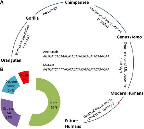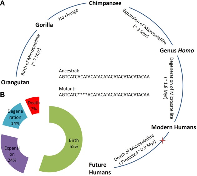 Figure 1. Evolution and life cycle of an n-globin pseudogene microsatellite locus. (A) Evolutionary time estimate for the species emergence and corresponding change in the n-globin pseudogene microsatellite locus, illustrating different stages of life cycle and predicting future steps. (B) Total percentage of time required for each stage in life cycle of n-globin pseudogene microsatellite locus as based on complete predicted life cycle in Panel A. Red star indicates the present humans on the evolution time scale and, that corresponds to the ~0.2 Myr. Hg19 genomic coordinates for the sequence: Chr11:5263798:5263832, positive strand.