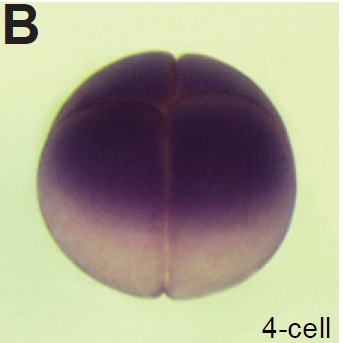 dorso-anterior view with posterior to the top. (J) Four-cell