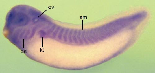 nc, notochord; ov, otic vesicle; ba, branchial arch; kt, kidney tubule; sm, somites. (J) Four-cell stage embryos were injected in the animal pole