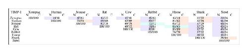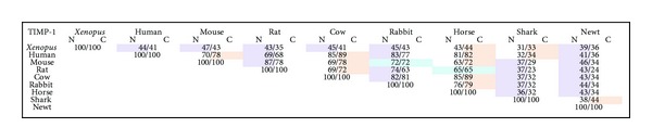 Figure 1. Evolutionary conservation of TIMP-1 N- and C-terminal domains. Sequence analysis comparing amino acid sequence identity of X. laevis TIMP-1 N- and C-terminal domains versus known (at the time of publication) vertebrate species. Light purple boxes represent species whose N-terminal domains were more highly conserved with X. laevis TIMP-1 than their C-terminal domains. Light pink boxes represent species whose C-terminal domains were more highly conserved with X. laevis TIMP-1 than their N-terminal domains. Blue boxes represent species with equal conservation with both X. laevis TIMP-1 N- and C-terminal domains.
