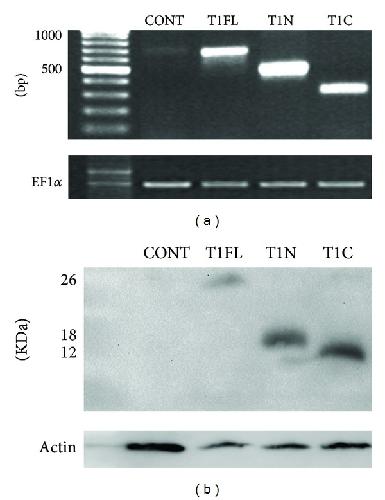 Figure 2. Confirmation of full-length, N-terminal, or C-terminal TIMP-1 constructs overexpressed in X. laevis embryos. 4âng of mRNA coding for full-length (T1FL), N-terminal (T1N), or C-terminal (T1C) TIMP-1 constructs was microinjected into X. laevis embryos at the 1-cell stage. (a) Overexpression of TIMP-1 mRNA as shown by RT-PCR analysis. RNA was isolated from stage 15 embryos. Control (uninjected) embryos expressed TIMP-1 at very low levels. Primers specific to each construct were used to confirm mRNA levels of T1FL (678âbp), T1N (453âbp), and T1C (252âbp). RT-PCR of EF1α was used as a loading control. (b) Increased levels of TIMP-1 constructs as shown by Western blot analysis. All constructs are HA tagged. Protein was isolated from stage 30 embryos. Anti-HA antibodies were used to confirm expression of each construct at the protein level (T1FL = 26âKDa, T1N = 18âKDa, and T1C = 12âKDa). No HA was detected in control uninjected embryos. β-actin was used as protein loading control.