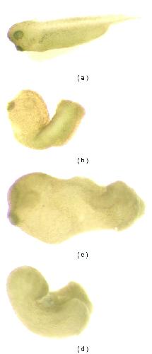 Figure 3. Phenotypic effects of overexpression of full-length, N-terminal, or C-terminal TIMP-1 constructs. Following injection, photographs were taken of representative embryos at stage 30. (a) Control (uninjected) embryos were phenotypically normal. Microinjection of T1FL (b) and T1N (c) constructs both resulted in normal anterior (head) development but truncated posterior axes. (d) Microinjection of T1C constructs resulted in lack of head structures, other head defects, and neural tube closure failure. Panel (a) magnification is lower than in (b), (c), and (d). Embryos are 1âmm in diameter.