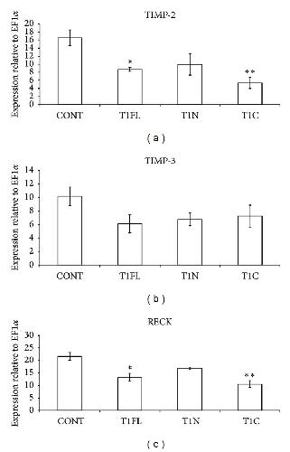 Figure 5. Effect of overexpression of full-length, N-terminal, or C-terminal TIMP-1 on mRNA levels of MMP inhibitors. Semiquantitative RT-PCR analysis was used to measure changes in mRNA levels of (a) TIMP-2, (b) TIMP-3, and (c) RECK at stage 30, following microinjection of 4âng of TIMP-1 full-length (T1FL), N-terminal (T1N), or C-terminal (T1C) constructs into X. laevis embryos at the 1-cell stage. In each case mRNA levels were measured relative to Ef1α. The results are presented as mean ± standard error from 3 independent experiments. *P < 0.05 and **P < 0.01, all versus control (CONT; uninjected) embryos, as analyzed by one-way ANOVA and Dunnett's post hoc test.