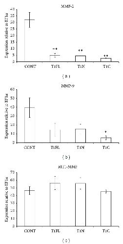 Figure 6. Effect of overexpression of full-length, N-terminal, or C-terminal TIMP-1 on mRNA levels of MMPs. Semiquantitative RT-PCR analysis was used to measure changes in mRNA levels of (a) MMP-2, (b) MMP-9, and (c) MT1-MMP at stage 30, following microinjection of 4âng of TIMP-1 full-length (T1FL), N-terminal (T1N), or C-terminal (T1C) constructs into X. laevis embryos at the 1-cell stage. In each case mRNA levels were measured relative to Ef1α. The results are presented as mean ± standard error from 3 independent experiments. *P < 0.05 and **P < 0.01, all versus control (CONT; uninjected) embryos, as analyzed by one-way ANOVA and Dunnett's post hoc test.