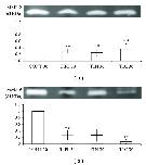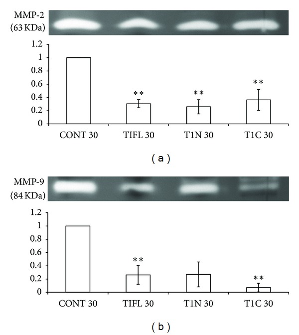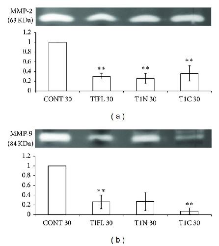 Figure 7. Zymography demonstrated altered levels of active MMP-2 and MMP-9 following overexpression of TIMP-1 constructs. 4âng of mRNA coding for full-length (T1FL), N-terminal (T1N), or C-terminal (T1C) constructs was injected into X. laevis embryos at the 1-cell stage and protein was isolated from stage 30 embryos. Gelatin zymography was used to measure changes in (a) MMP-2 and (b) MMP-9 activity. Zymogram (top) is representative of one experiment where the bright brand represents the active forms (63 and 84âkDa) of MMP-2 and MMP-9, respectively. Graphs represent quantification of above zymogram, and data is presented as mean ± standard error from 3 independent experiments. *P < 0.05 and **P < 0.01, all versus control (CONT; uninjected) embryos, as analyzed by one-way ANOVA and Dunnett's post hoc test.