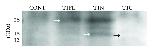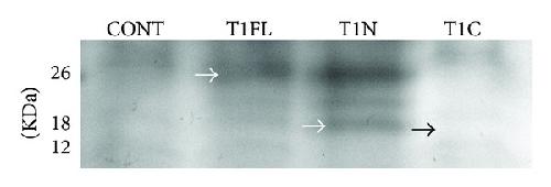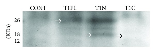 Figure 8. Reverse zymography demonstrating full-length and N-terminal, but not C-terminal, TIMP-1 can directly inhibit MMP activity. 4 ng of mRNA coding for full-length (T1FL), N-terminal (T1N), or C-terminal (T1C) TIMP-1 constructs was injected into X. laevis embryos at the 1-cell stage and protein was isolated from stage 30 embryos. MMP-inhibitory activity is represented by dark bands. White arrows indicate the location of the expected inhibitory band of the T1FL (26 KDa) and T1N (18 KDa) constructs, respectively. Black arrow represents position of T1C (12 KDa) construct, which cannot inhibit MMP activity as suggested by the light band.