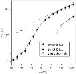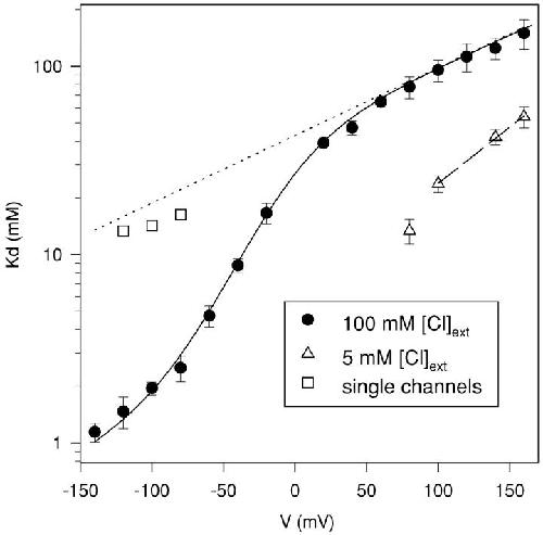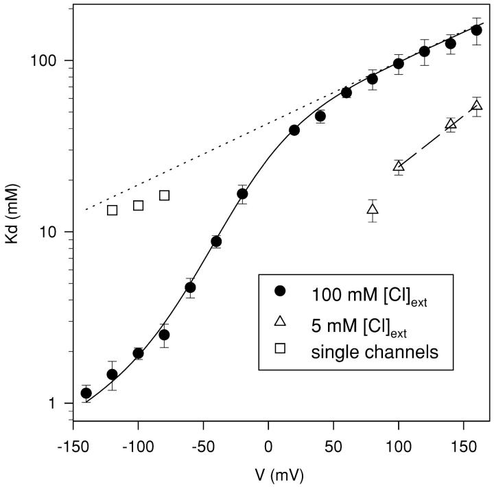 Figure 3. . Voltage dependence of CPA block. From the mean values of the ratio of the steady-state current in presence and absence of CPA, I(CPA)/I(0), for CPA concentrations of 1, 5, and 20 mM the apparent dissociation constant, KD, was obtained by a fit with Eq. 1 for voltages ranging from −140 to +140 mV. The resulting KD values are plotted as a function of voltage (filled circles). The open squares are the KD values measured from the open channel block of single channels. The open triangles are the KD values were measured at 5 mM extracellular Cl−. The straight, dotted line represents the extrapolation to voltages between −140 and +160 mV of a fit of the KD values for V > 60 mV measured in high (100 mM) extracellular Cl− with Eq. 2. It has a slope corresponding to an apparent electrical distance of 0.21. The dashed straight line is a similar fit to the values measured with 5 mM extracellular Cl− for V ≥ 100 mV with z = 0.35. The solid line represents the fit of Model 1 with H as a single free parameter (see materials and methods), resulting in H = 20. Error bars are SEM.