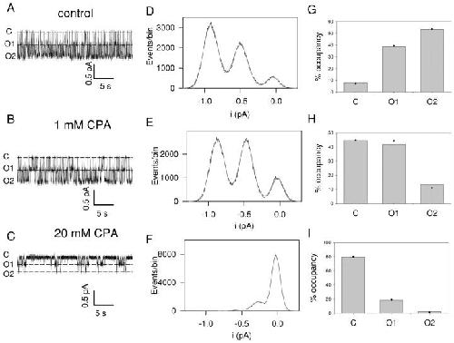 Figure 5. . Inhibition of single protopores. A single CLC-0 channel present in an inside-out patch was measured at a holding potential of −80 mV in control conditions (A) and in the presence of 1 mM CPA (B) and 20 mM CPA (C). Next to each trace (D–F) is an amplitude histogram of the complete recording together with a fit of the sum of three Gaussian components (dashed gray lines). The peaks of the Gaussian fits are indicated as dashed lines on the current traces. The respective area of each Gaussian component was used to calculate the relative open probability of each conductance state. G–I show the binomial fits. Gray bars represent the values from the traces in A–C, while the filled circles are the expected values from the binomial fits.