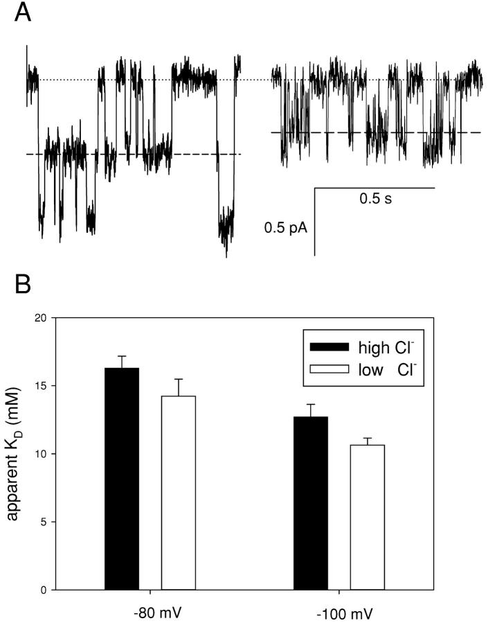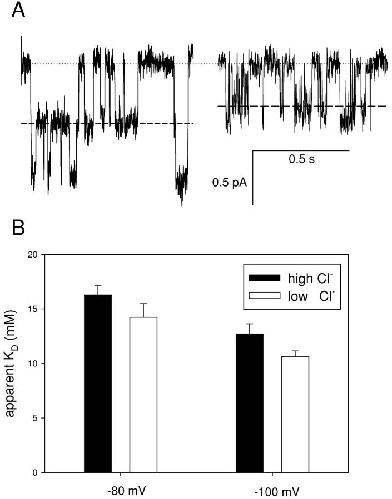 Figure 9. . Effect of [Cl−]ext on the open channel KD at negative voltages. (A) Open channel block with 5 mM [Cl−]ext. Stretches of a single-channel recording without (left) and with 5 mM CPA in the intracellular solution (right) at −80 mV are shown. The dotted line represents the zero current level, the dashed line the current level associated to one pore open. (B) Comparison of the open channel KD in high (black bars) and low (gray bars) [Cl−]ext at −80 and −100 mV. Errors bars are SEM.