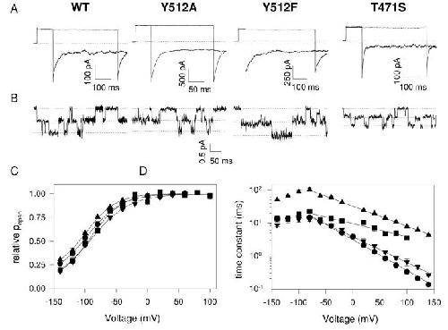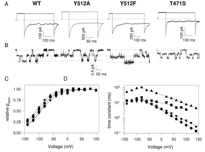 Figure 11. . Properties of mutants. (A) Macroscopic traces of WT CLC-0, Y512A, Y512F, and T471S mutants. After a prepulse to 60 mV the voltage was varied between −140 and +60 mV followed by a constant tail pulse to −140 mV. Pulse duration was adjusted depending on the characteristics of the different mutants. Only the traces at −140 and +60 mV are shown for clarity's sake. The dotted line represents zero current level. (B) Single-channel traces recorded at −100 mV. The traces were acquired at 1 KHz and digitally filtered at 500 Hz for display. The three dotted lines represent the three conductance levels found in CLC-0 single-channel recordings. (C) Activation curves for the WT (circles), T471S (inverted triangles), Y512A (squares), and Y512F (triangles). Solid lines represent fits obtained with the following equation: f(V)=P0 + (1 − P0)/(1 + exp(zF(V1/2 − V)/RT)) where P0 is the residual open probability at most negative voltages, V1/2 is the half activation potential, and z is the apparent gating charge. (D) Voltage dependence of the time constants of the WT and mutant channels. Symbols are the same as in C. Solid lines represent fits obtained with Eq. 4 for V > −60 mV.