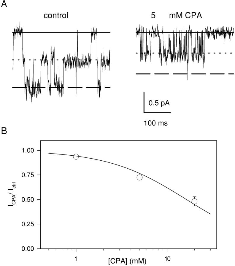 Figure 6. . Fast open channel block by CPA. (A) The fast open channel block is illustrated at an expanded time scale. Short stretches of a single-channel recording without (left) and with 5 mM CPA in the intracellular solution (right) at −100 mV are shown (digitally filtered at 1 kHz). The solid line represents the zero current level, the dotted line represents the current level associated to one pore open, and the dashed line represents the current level due to the simultaneous opening of two pores. (B) Long events like those shown in Fig. 5 were used to estimate the current reduction caused by the fast flickery block. Mean values of the ratio of the open channel current with and without CPA is plotted as a function of the CPA concentration at −80 mV. The solid line is a fit of Eq. 1. A similar analysis was performed also at −120 and −100 mV and the resulting KD values are shown in Fig. 3 as open squares.